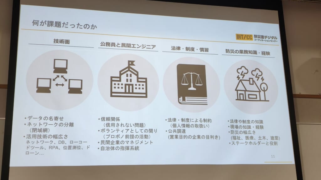 後続のセッションでは本件の構築に実際に関わった、耐災害デジタルコーディネーションセンターの、杉井氏、山本氏からの説明がありました。