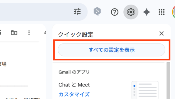 ブラウザGmailの設定アイコンから全ての設定を表示をクリックします。