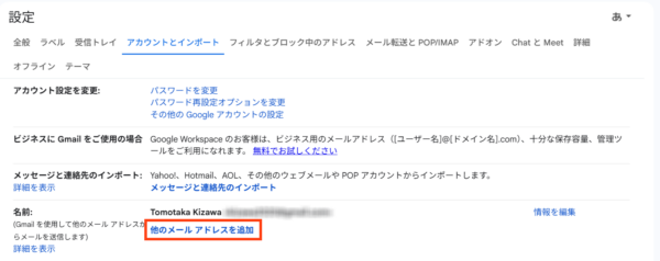 アカウントとインポート内にある、「他のメールアドレスを追加」をクリックします。