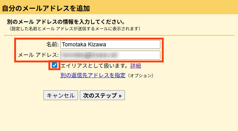 「エイリアスとして扱います」については、私はチェックを入れました。