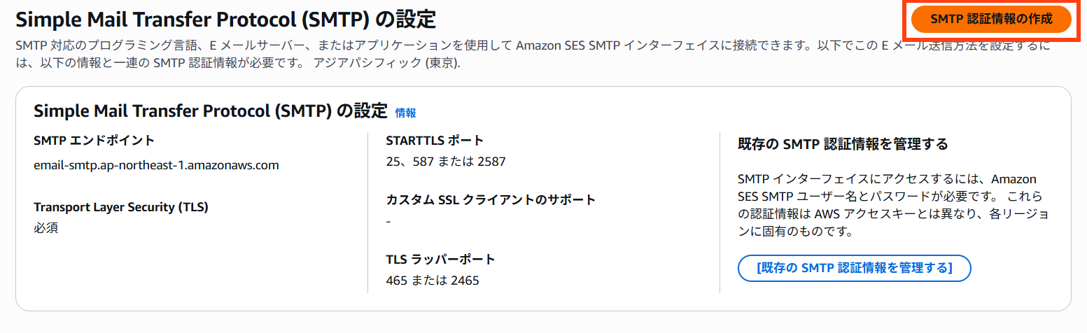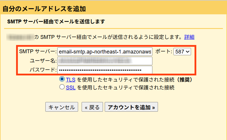 SMTPサーバー(東京リージョンの場合は mail-smtp.ap-northeast-1.amazonaws.com )と、ユーザー名・パスワードを入力します。