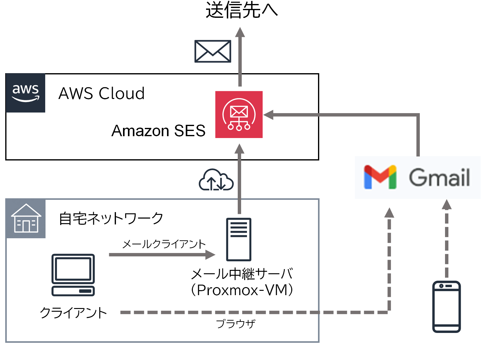 私の自宅ネットワーク内にはProxmox VE上で立てているDNS/MTAのメール中継サーバー(VM)がありますので、メールクライアントそのサーバを経由してAmazon SESに転送するようにします。