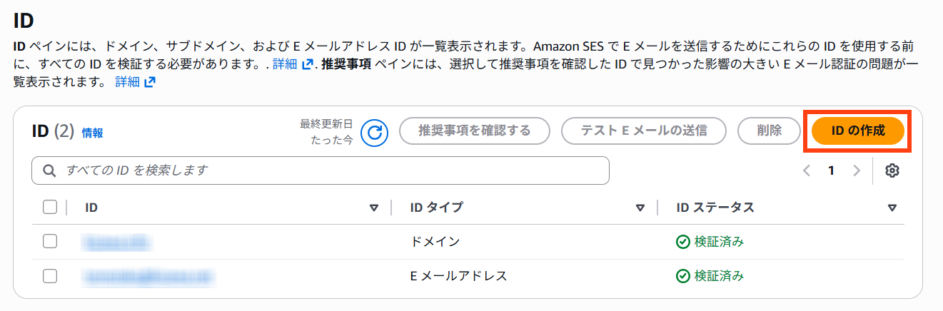 Amazon SESのコンソールから、設定⇒IDを開きます。