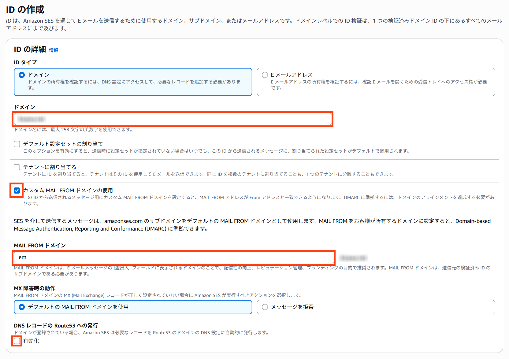 「カスタムMAIL FROMドメインの使用」はチェックを入れることが推奨され、有効にした場合はエンベロープFromに利用する独自ドメインのサブドメイン名を指定します。