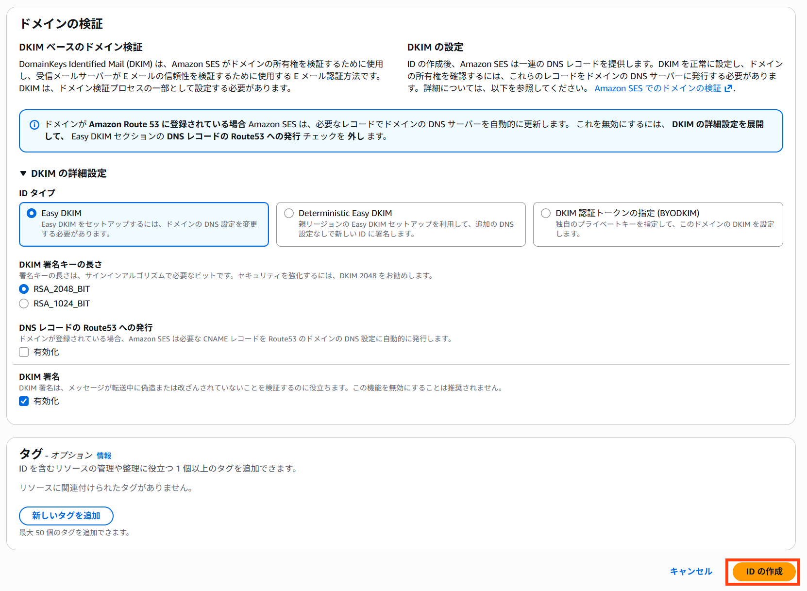 ドメイン検証(DKIM)の設定については、デフォルトのままとしました。