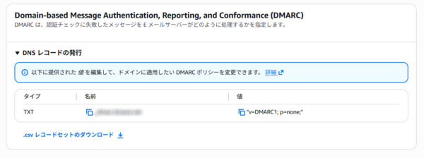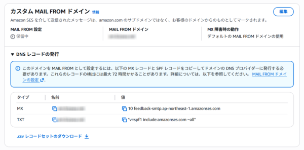 この手続きによりAmazon SESが独自ドメインのメールを配信する正規のメールサーバーであることを証明できるようになります。