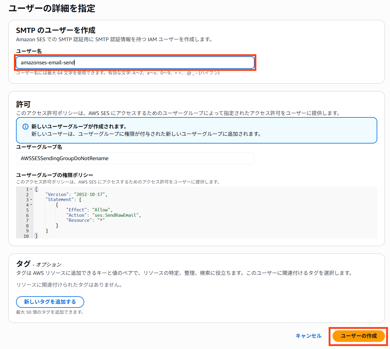 SMTP Authの認証情報を発行するため、IAMユーザーを作成します。