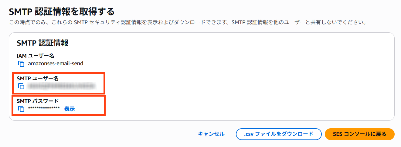 SMTPユーザー名とパスワードをダウンロードして保存しておきます。